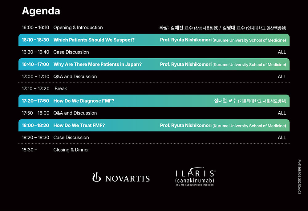 저희 한국노바티스 일라리스팀에서는 다가오는 2026년 1월 24일(토), 그랜드하얏트서울 호텔에서 FMF(Familial Mediterranean Fever)의 이해를 높이고, 한국 및 일본에서의 진단 치료 전략을 심도 있게 논의하기 위한 FMF Pioneers Symposium을 진행하고자 합니다.